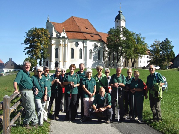 Der vierte Tag sollte nicht so anstrengend werden und mehr dem kulturellen Teil dieser Wanderwoche gerecht werden. Wir fuhren nach Trauchgau – Oberreithen, parkten unsere Autos an einen sicheren Parkplatz und gingen auf dem wunderschönen „König-Ludwig-Wanderweg“ zur Wieskirche. Erbaut wurde die Wieskirche von den Brüdern Johann Baptist und Dominikus Zimmermann im Jahre 1745 bis 1754. Die „Wallfahrtskirche zum Gegeißelten Heiland auf der Wies“ wurde 1983 zum Weltkulturerbe erklärt. Heute besuchen jährlich mehr als eine Million Menschen die Kirche. Sie ist auch regelmäßig Veranstaltungsort von kirchenmusikalischen Konzerten. Nach der Besichtigung des Gotteshauses und dem obligatorischen Mittags-Imbiss wanderten wir wieder auf schönen Wanderwegen durch Wälder, Wiesen und Felder zurück zu unseren Fahrzeugen.