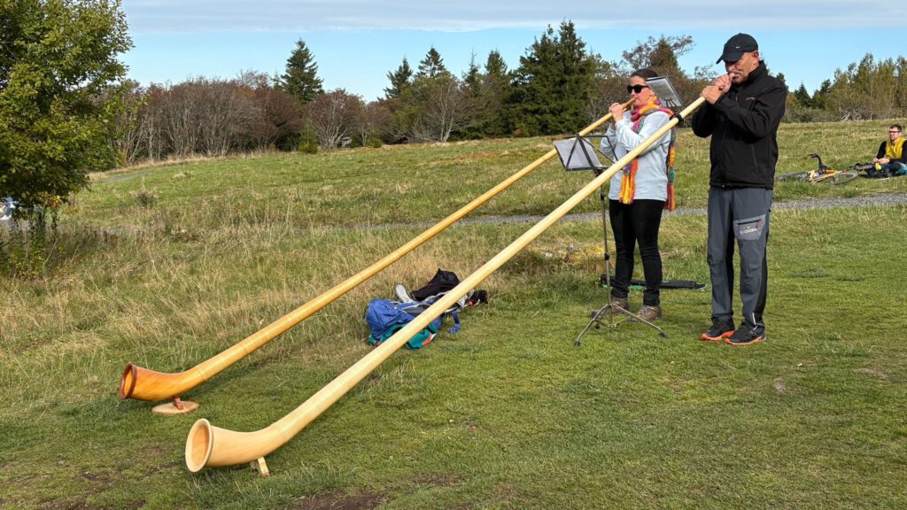 Neben der musikalischen Arbeit kam auch die Freizeit nicht zu kurz. Bei strahlendem Herbstwetter wanderte die Gruppe am Freitagnachmittag zum Kloster Kreuzberg. Oben angekommen, sorgten zwei Alphornspieler aus den eigenen Reihen für ein besonderes Highlight: Ein kleines Platzkonzert inmitten der Rhönlandschaft ließ nicht nur die Musiker, sondern auch vorbeikommende Wanderer staunen.